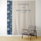 This wedding backdrop features a sophisticated split design with a dark blue floral pattern on the left, adorned with large white roses and smaller pink and green flowers. The right side offers a clean, light beige background that highlights customizable text in elegant serif fonts, perfect for personalizing your special day. The combination of classic floral motifs and refined typography creates a timeless and formal atmosphere, ideal for weddings or other significant celebrations.
