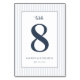 This elegant wedding table card features a minimalist design with a large, navy blue number "8" as its focal point. The layout is clean and sophisticated, framed by light blue vertical stripes on either side against a white background. The typography combines a cursive script for the word "table" and a simple sans-serif font for additional text, creating a modern yet classic look. Perfect for adding a touch of understated elegance to your wedding reception, this card conveys sophistication and formality through its color palette and straightforward composition.