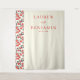 This elegant wedding backdrop features a balanced layout with a vibrant cherry pattern on the left and ample negative space on the right, creating a modern yet classic aesthetic. The design uses a striking red colour palette against a neutral background, enhancing its sophisticated and celebratory mood. Customisable text in a bold serif font is prominently displayed, allowing for personalisation of names and dates. Perfect for weddings, this backdrop combines natural motifs with formal typography to create an inviting atmosphere for your special day.