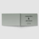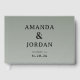 This wedding guest book features a minimalist design with a muted sage green background, creating an elegant and modern aesthetic. The layout is centred, showcasing bold serif typography for the names, followed by a simple ampersand divider. A lighter font style highlights the location and date below, adding subtle sophistication. The clean composition emphasizes clarity and timelessness, making it perfect for formal occasions like weddings.