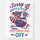 Vibrant, colourful design featuring a cartoon racoon wearing cowboy hat ridding a cartoon roadrunner. The colourful text reads: "Sorry gotta go the vibes are off". This design is available on a wide variety of products.