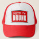 It's the very funny, "Sorry I'm Drunk" trucker hat! Featuring the classic rectangular red and white we're closed sign, with the words "I'm drunk" instead. A great party hat for any occasion. Choose this design on different hat colours, and grab yours today!