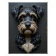 A highly detailed ceramic relief tile depicting a head-and-shoulders portrait of a scruffy terrier-mix dog. The dog gazes directly outward with soulful, glossy warm-brown glazed eyes, conveying lifelike emotion. Its wiry fur is meticulously sculpted in strands and clumps, then finished with layered glazes: deep glossy black for the coat, matte silvery-white for expressive eyebrows and highlights, and soft satin beige for the muzzle, beard, and chest patch. The nose is rendered in a high-gloss, wet-look glaze for realism. Set against a dark, matte-glazed ceramic background, the portrait stands out with striking clarity. The even lighting emphasizes the dimensional textures and expert glaze craftsmanship, creating a vivid, lifelike representation in ceramic form.