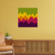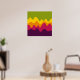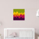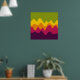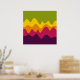 A design made up of irregular wave or hill like shapes arranged like a landscape with a progression of bands one behind or on top of another abstractly playing with colour and space. The design is also very reminiscent of sound and music with the wave like shapes and harmonising colours.