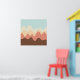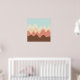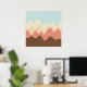 A design made up of irregular wave or hill like shapes arranged like a landscape with a progression of bands one behind or on top of another abstractly playing with colour and space. The design is also very reminiscent of sound and music with the wave like shapes and harmonising colours.