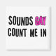 Express yourself with this unique and funny “Sounds Gay. Count Me In” design. Great for Bachelor Parties and Gay Pride Parades!
