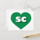 This postcard features a vibrant green heart containing the bold, white, rounded lower case letters sc, a playful abbreviation for South Carolina, the palmetto state. The reverse side of the card is blank, awaiting your handwritten sentiments or customised text.