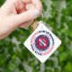 The South Dakota State Keychain has a circular typography design with red, white, and blue colours on a white background. The text includes the state's name, capital, state abbreviation, resident's name, region, time zone, geographic coordinates, the year of its statehood, and the country - The United States of America. Unique patriotic gift idea.