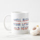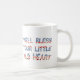 Enjoy your coffee or other beverage in a cup with a Southern twist. From Southerners you're likely to hear WELL BLESS YOUR LITTLE OLD HEART or some form of it. This design is made in a scrawled writing or painted appearing font, with a hint of a US flag worked in. Design is shown on a white background, but you can add a background colour if desired. It is also on both sides of cup for better visibility.