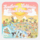 Bright and colourful scene offers a spectacular view of Southern California - wacky characters frolic on the beach and desert of SoCal showcasing Los Angeles, Orange County, San Diego, Santa Barbara, Riverside, Palm Springs, El Centro, Salton Sea, Anza Borrego and Joshua Tree parks as well as many others. This charming scene has it all – a surfer hangs ten while a killer whale leaps out of the water, zoo animals greet the tourists, and a tank rumbles in the distance among dozens of other happy people and creatures enjoying the socal sunshine...