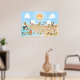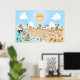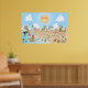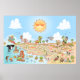 Bright and detailed whimsical vision of Southern California - featuring Los Angeles, Anaheim, Long Beach, San Diego and other major cities plus most beach towns - zany characters play on the beach and desert, mountains and valleys. This charming scene has it all – a surfer hangs ten while a mermaid lounges on a rock, a killer whale leaps out of the water as a t-rex roars a challenge, a muscular beach couple both flex to impress, zoo animals wait for tourists and a bull smashes into a bull fighter…