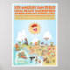 Bright and charming poster shows a spectacular cartoon of Southern California – Los Angeles, Anaheim, Long Beach, San Diego. This charming scene has it all – a surfer hangs ten while a mermaid lounges on a rock, a killer whale leaps out of the water, a muscular beach couple both flex to impress, zoo animals wait for tourists, a bull smashes into a bull fighter, and much more…
