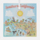 A cartoon of Southern California – showcasing Los Angeles, Anaheim, Long Beach, San Diego and other cities plus most beaches. Cartoon characters of all sorts swim and splash and play beneath the bright California sun shining high above it all.