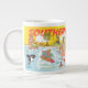Bright and detailed whimsical cartoon of Southern California - featuring Los Angeles, Anaheim, Long Beach, San Diego and other major cities plus most beach towns - zany characters play on the beach and desert, mountains and valleys. This charming scene has it all – a surfer hangs ten while a mermaid lounges on a rock, a killer whale leaps out of the water as a t-rex roars a challenge, a muscular beach couple both flex to impress, zoo animals wait for tourists and a bull smashes into a bull fighter…