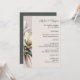 Wedding menu with a southern theme. White magnolia flowers decorate the edge on pink-beige paper. Menu text is aligned to the right side. Personalise with names of the couple at the top. Title and date are in bold printed font, with all menu items listed in paragraph form. Add, and remove, spaces as needed for your event. Reverse is solid very dark green. Also comes as an instant download to print your own, or share online.