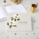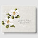 Chic wedding guest book done in a natural ivory coloured linen look. Pretty vintage artwork of white magnolia blooms decorate the front and back cover. Personalise the black text fields for your special day. Matching wedding products are available.