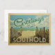 This Greetings From Southold vintage postcard design features a sandy beach with a beautiful turquoise ocean water and above the sea, a blue sky with billowy white clouds. In vintage travels style.