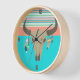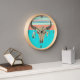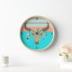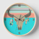 Southwestern inspired wall clock done in turquoise, coral, blush and mint. Graphics of a feather decorated bull's skull, and stripes decorate the clock. Customise to add your own text.