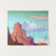 Tapestry in a boho / minimalist style illustration of a Southwestern desert scene of terracotta mountain peaks with an aqua sky