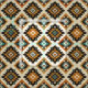 The image is a digital graphic designed as a repeating pattern or background. It features a geometric design with a distinct Southwestern or Native American-inspired aesthetic. The pattern consists of repeating diamond and star-like shapes arranged in horizontal and vertical rows. The colour palette is warm and earthy, with prominent use of orange, brown, teal, and cream. The geometric elements incorporate stepped patterns and angular lines, characteristic of traditional Southwestern textiles and art. The overall style is bold and visually striking, suggesting themes of tribal patterns, ethnic designs, and possibly cultural heritage.