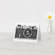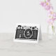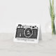 A card with a high contrast image of a vintage Soviet Russian range finder camera from the 1950s/60s.