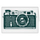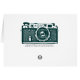 A card with a high contrast image of a vintage Soviet Russian range finder camera from the 1950s/60s.