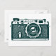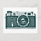 A postcard with a high contrast image of a vintage Soviet Russian range finder camera from the 1950s/60s.
