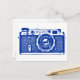 A postcard with a high contrast image of a vintage Soviet Russian range finder camera from the 1950s/60s.
