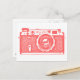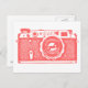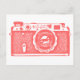 A postcard with a high contrast image of a vintage Soviet Russian range finder camera from the 1950s/60s.