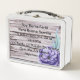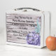 Bella lonchera de comida con diseño de flor purpura y textos bíblicos de Filipenses 4:13 “Todo lo puedo en Cristo que me fortalece”, Filipenses 4:19 “Dios suplira todo lo que hos falta…”, y otros versos bíblicos. Otro verso escrito en esta Lonchera es “Soy Tierra Fértil Para Buena Semilla y Jesucristo me da la Victoria.”