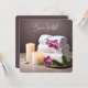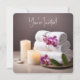Bright pink orchids with towels, hot stones, and candles for spa bridal shower.