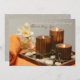 A stylish design featuring a rolled towel and a tray with three lit candles and river rocks. A branch of creamy cymbidiums adorns the tray. (PB)