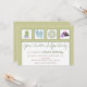 A spa party invite featuring a green background an a landscape orientation. Four white squares at top, each with a picture inside. Candles, flip flops, cucumber, and spa stones with orchids. Personalise the text with details of your occasion.