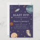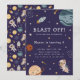 Cute space themed kids birthday invitation featuring playful astronaut, planet and star illustrations paired with fun, stylish typography on different color backgrounds. You can find more matching items from this collection in our store.