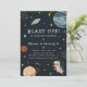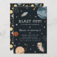 Cute space themed kids birthday invitation featuring playful astronaut, planet and star illustrations paired with fun, stylish typography on different color backgrounds. You can find more matching items from this collection in our store.