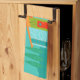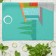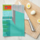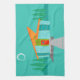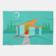 This Space Age Cartoon House Kitchen Towel is a retro lover’s dream come true. The minimalist art design features an aqua stone house with large, peacock blue windows. Hanging from the atomic, slanting, orange roof, a yellow sputnik light fixture illuminates the front door. The recessed red front door with starburst doorknob is beautifully offset by the vertical green wood planks of the exterior entryway. A grey stone path cuts across the pristine lawn, which appears turquoise in the moonlight. Behind the house, a row of a tall, thin, trees point to the turquoise sky and the white silhouette of a full moon. While no people are visible, on a night like this, the kitschy house’s inhabitants are probably inside watching news footage of the astronauts.