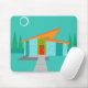 This Space Age Cartoon House Mouse Pad is a retro lover’s dream come true. The minimalist art design features an aqua stone house with large, peacock blue windows. Hanging from the atomic, slanting, orange roof, a yellow sputnik light fixture illuminates the front door. The recessed red front door with starburst doorknob is beautifully offset by the vertical green wood planks of the exterior entryway. A grey stone path cuts across the pristine lawn, which appears turquoise in the moonlight. Behind the house, a row of a tall, thin, trees point to the turquoise sky and the white silhouette of a full moon. While no people are visible, on a night like this, the kitschy house’s inhabitants are probably inside watching news footage of the astronauts.