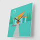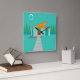 This Space Age Cartoon House Square Acrylic Wall Clock is a retro lover’s dream come true. The minimalist art design features an aqua stone house with large, peacock blue windows. Hanging from the atomic, slanting, orange roof, a yellow sputnik light fixture illuminates the front door. The recessed red front door with starburst doorknob is beautifully offset by the vertical green wood planks of the exterior entryway. A grey stone path cuts across the pristine lawn, which appears turquoise in the moonlight. Behind the house, a row of a tall, thin, trees point to the turquoise sky and the white silhouette of a full moon. While no people are visible, on a night like this, the kitschy house’s inhabitants are probably inside watching news footage of the astronauts.