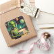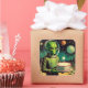 This delightfully strange set of stickers features a vintage-style illustration of a green space alien holding a birthday cake topped with a single glowing candle, all set against the backdrop of an alien landscape with distant planets and twinkling stars overhead. It’s a perfect fusion of retro science fiction, pop surrealism, and that oddly touching lowbrow art aesthetic that celebrates the weird, the whimsical, and the slightly melancholic. The green alien, with its oversized head and large black eyes, wears a blank but gentle expression—like it understands that birthdays are a big deal, even if it doesn’t quite know why. There’s a sweetness to the scene, underscored by the surreal juxtaposition of cake and cosmos, as if the alien has travelled galaxies just to bring you this modest but heartfelt dessert.