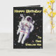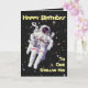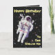 Birthday card featuring an astronaut or cosmonaut in space with stars, galaxies and planets. All text can be personalised and the astronaut is a separate graphic that can be sized, moved or removed in this birthday card design template.