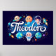 Beautiful wall art showcasing a magical space scene with adorable planets, astronauts, and celestial wonders featuring the name Theodore. Perfect for bedrooms, nurseries, or any space lover's room.