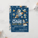 Set against a vibrant navy blue and orange galaxy background, this gender-neutral invitation is perfect for little explorers — whether boy or girl — celebrating their first trip around the sun. The playful “3…2…1… Blast Off!” headline adds excitement, making it ideal for a space-themed first birthday party.