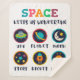 Playful space themed artwork made for curious kids and young students. Cute symbols like UFO, planet, moon, stars, rocket and alien help children explore space science and basic astronomy in a fun and friendly way.