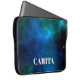 A custom laptop case with a blue space background. Add your own name to this product by using the custom template.