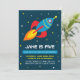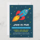 Invite friends and family to an out of this world Space Birthday invitation featuring a space ship. This will make a great birthday invitation for boys and girls. This invitation also includes a patterned back side.