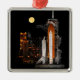The space shuttle Discovery sits on the launch pad 39A at Kennedy Space Centre in Cape Canaveral Florida. A nearly full moon glows in the night sky to add a dramatic background.
