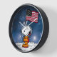 This Peanuts artwork celebrates the 50th Anniversary of the 1969 Apollo 10 orbit of the moon and the Apollo 11 moon landing. This design features Snoopy in his orange space suit flying the American flag.