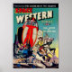 A poster of the vintage comic 'Space Western' with a cowboy and a woman on horseback being pursued by a spacecraft.
