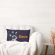 A personalised lumbar pillow with a dark blue background with yellow stars scattered around. Layered over top is an illustration of a spaceman wearing a white astronaut suit floating in space. Off in the distance are planets with rings and a rocket ship blasting off to places unknown.