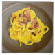 A close up photograph of spaghetti carbonara dish printed on a ceramic tile.